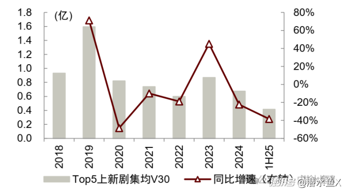 这是已经播出的情况,更不用说从今年年初就开始一直在传的产量骤减,优酷、爱奇艺等平台都在对长剧控量、减集的传闻。中金的研报显示,长视频平台Top5上新连续剧剧集均V30除2023年外,2020年至今均有同比下降;而他们的剧集播放量自2020年Q1开始呈下降趋势,跟他们的巅峰播放600亿-700亿相比,已经跌去了整整一半。根据国家广电总局公示,2025年的剧集播出为360部、发行数为106部,均为2016年以来最低点。
