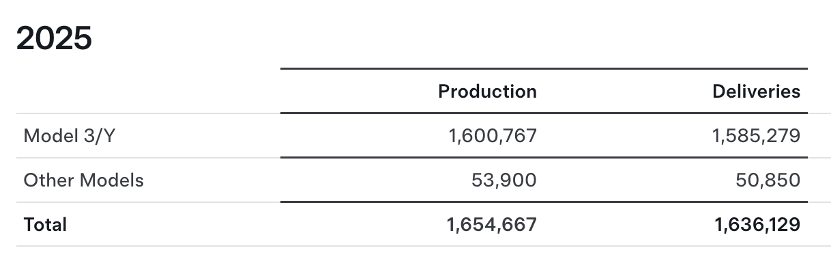 全年来看,特斯拉2025年共生产165.47万辆,同比下降6.67%;累计交付163.61万辆,同比下滑8.55%。