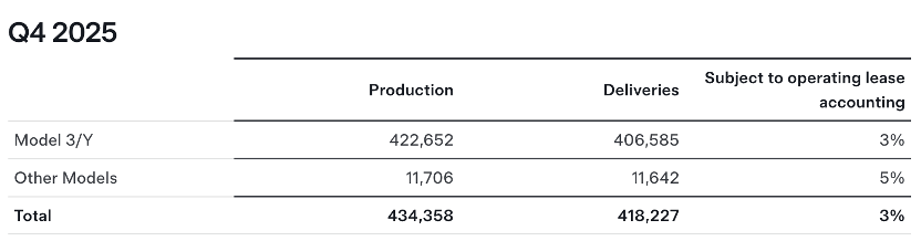 1月2日,特斯拉官方发布的数据显示,公司2025年第四季度共生产汽车43.44万辆,同比下降5.46%;交付量为41.82万辆,低于机构预测的平均值42.29万辆,同比下降15.61%。特斯拉的能源产品持续增长,其第四季度部署了14.2GWh的储能产品,再创历史新高。
