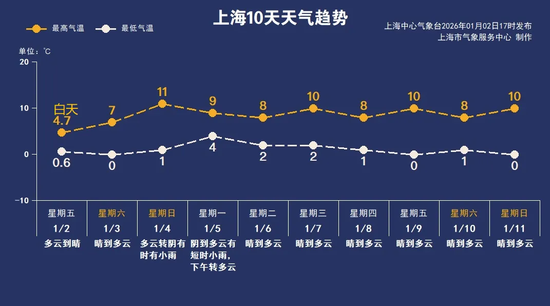 另据上海市气象服务中心的预报,元旦假期过后,阴雨来串场,4日后期至5日前期,有一次小雨过程,6日起晴好天气重新上线。下周气温波动不大,最高气温在8~10℃,最低气温0~4℃,冬日体感拉满,防寒保暖不能松懈,注意用火用电安全。