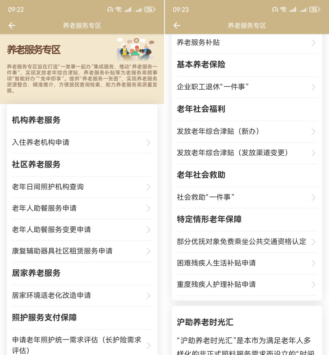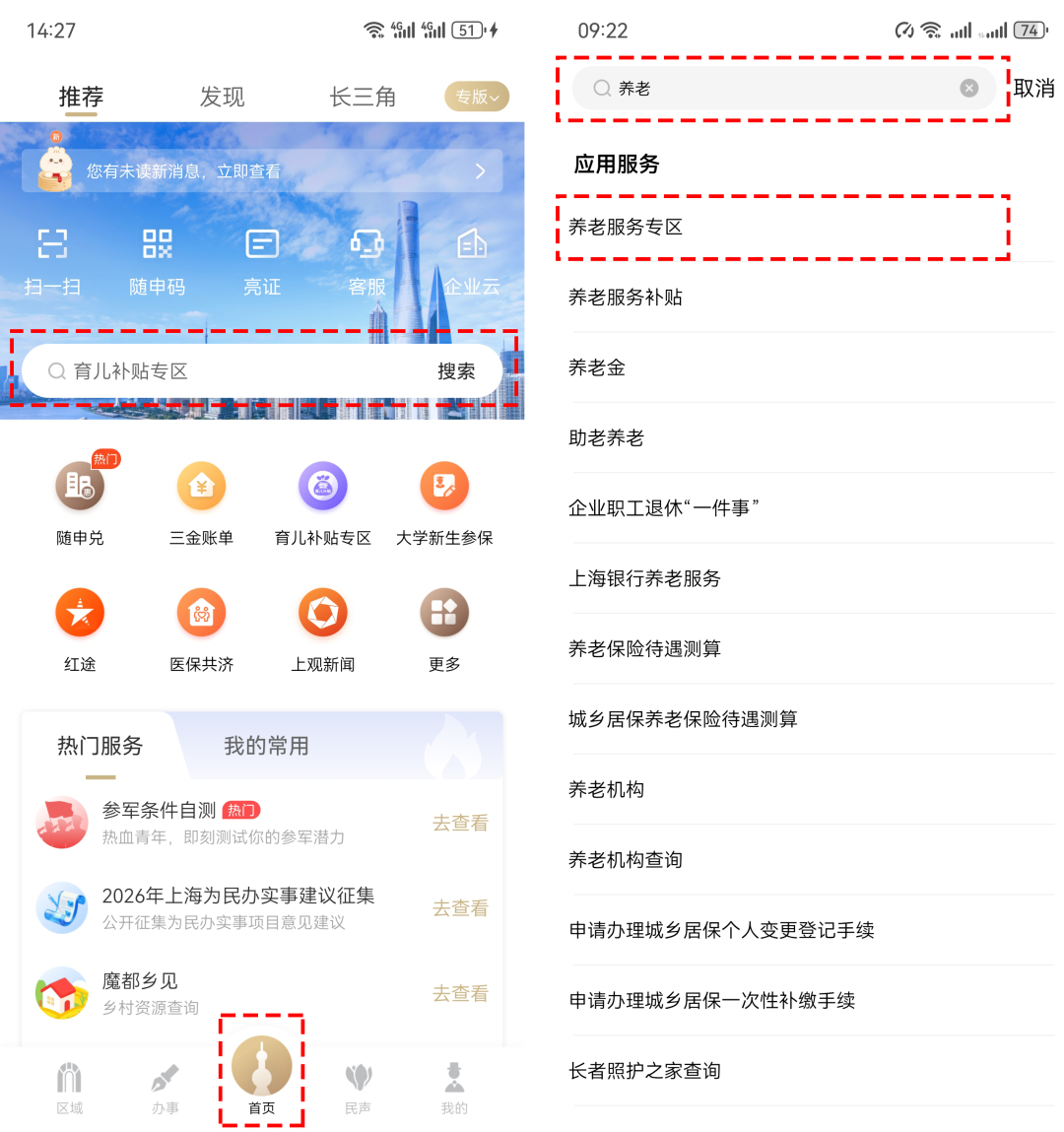 打开“随申办市民云”APP,在首页的搜索栏输入「养老服务专区」,或通过首页热门服务中的「养老服务专区」进入,即可轻松办理各类相关服务。