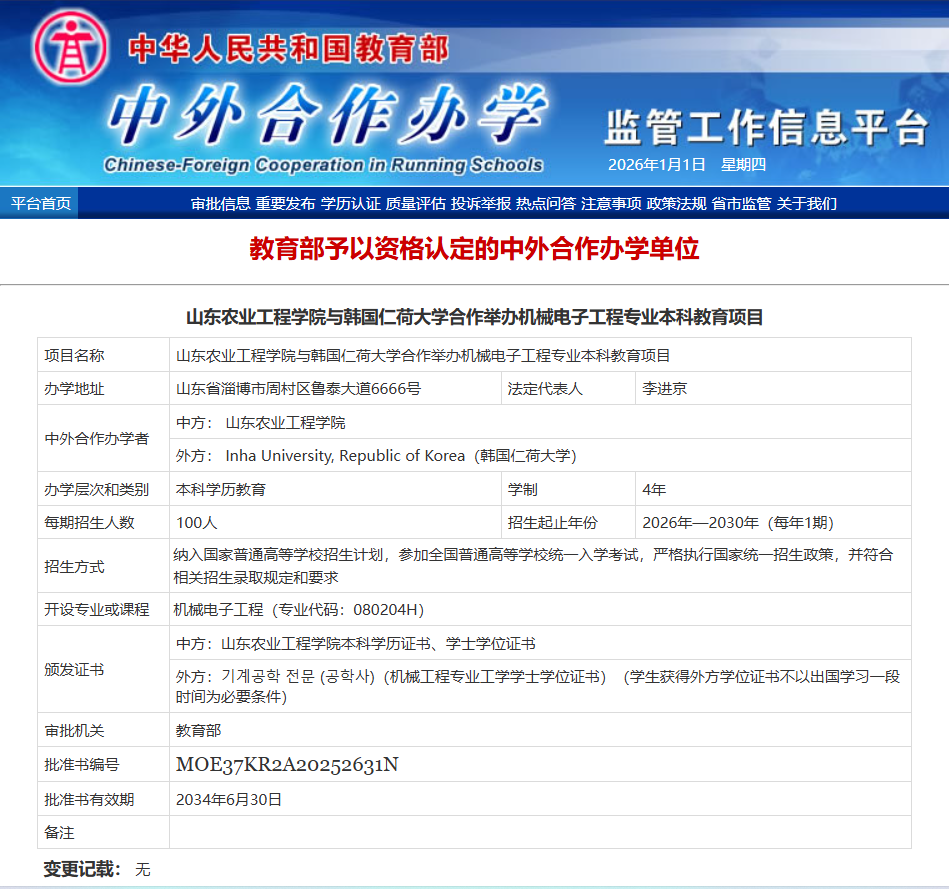 近日,学校与韩国仁荷大学合作举办的机械电子工程专业本科教育项目成功获得教育部审批通过。这是继环境生态工程专业后,学校获批的第二个本科层次中外合作办学项目,标志着在国际化办学方面实现新的突破。