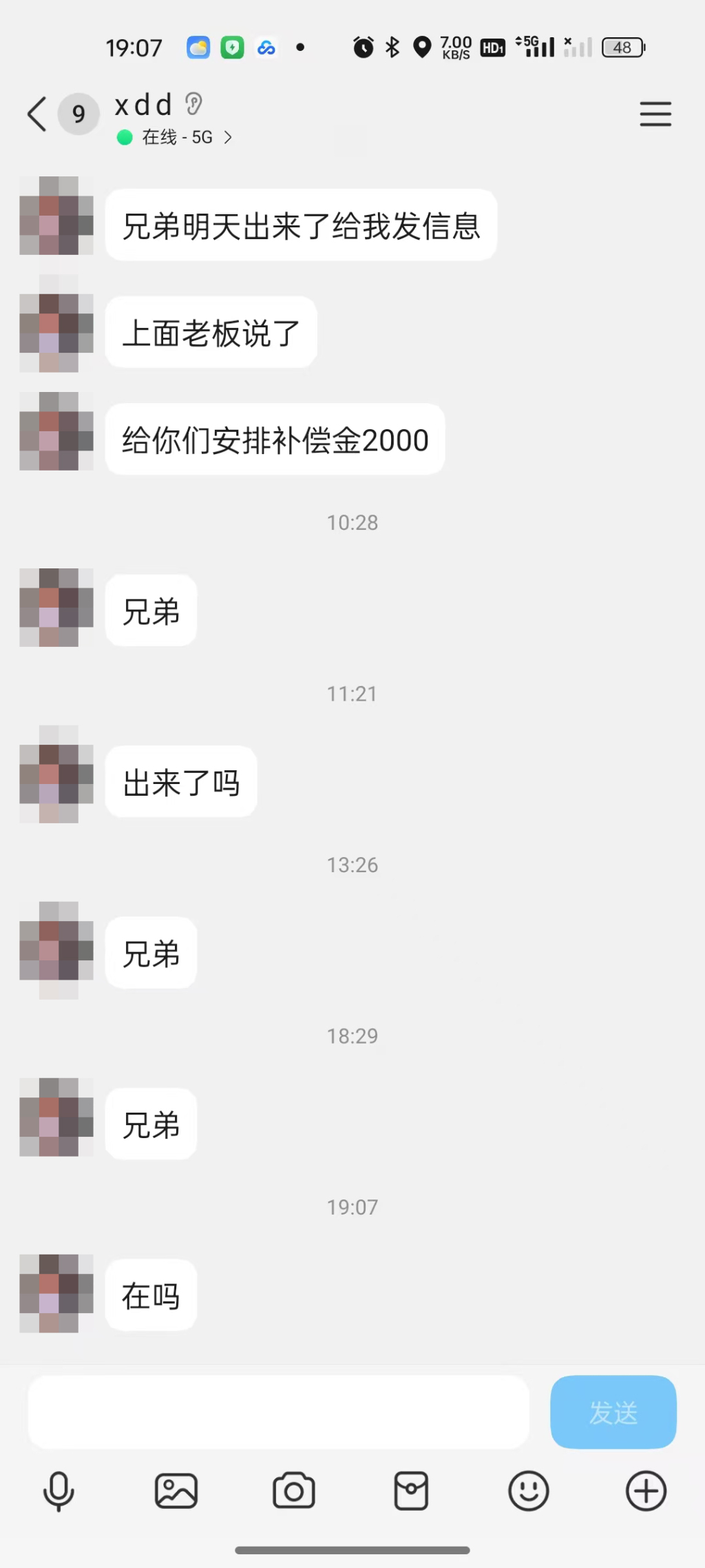 而在司机被抓后,对方给朱先生连发多条信息,询问“出事了?”,还称“明天就出来了兄弟,没事的”“明天接着干”,并称“上面老板说了,给你们安排补偿金2000”。朱先生未回复信息。