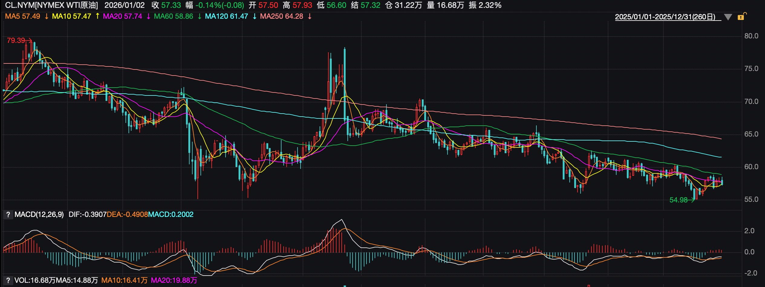 2025年国际油价全年走势疲软,WTI原油2025年12月31日收盘跌0.95%,报57.46美元/桶;布伦特原油2025年12月31日收盘跌0.73%,报61.3美元/桶。WTI原油全年跌约20%,第一季度一度飙升至82.03美元/桶,但随后恢复下行趋势,一度跌至55美元/桶附近;布伦特原油全年跌约18%,创下自2020年来最大年度跌幅。