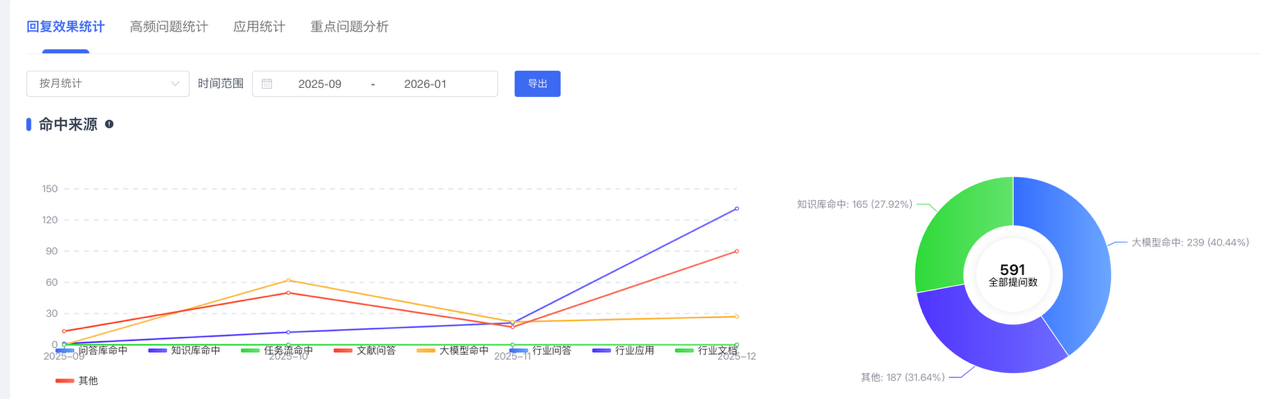 从2025年9月上线,到12月提交论文,选课学生中有超过75%访问了AI助教,约60%向AI助教提出了问题。在所有提出问题的学生中,约有40%进行了10轮及以上的对话。从访问时间来看,出现过两个高峰。第一个高峰在10月,命中提问的信息主要来自大模型本身。第二个高峰在12月,命中问题的信息主要来自知识库。