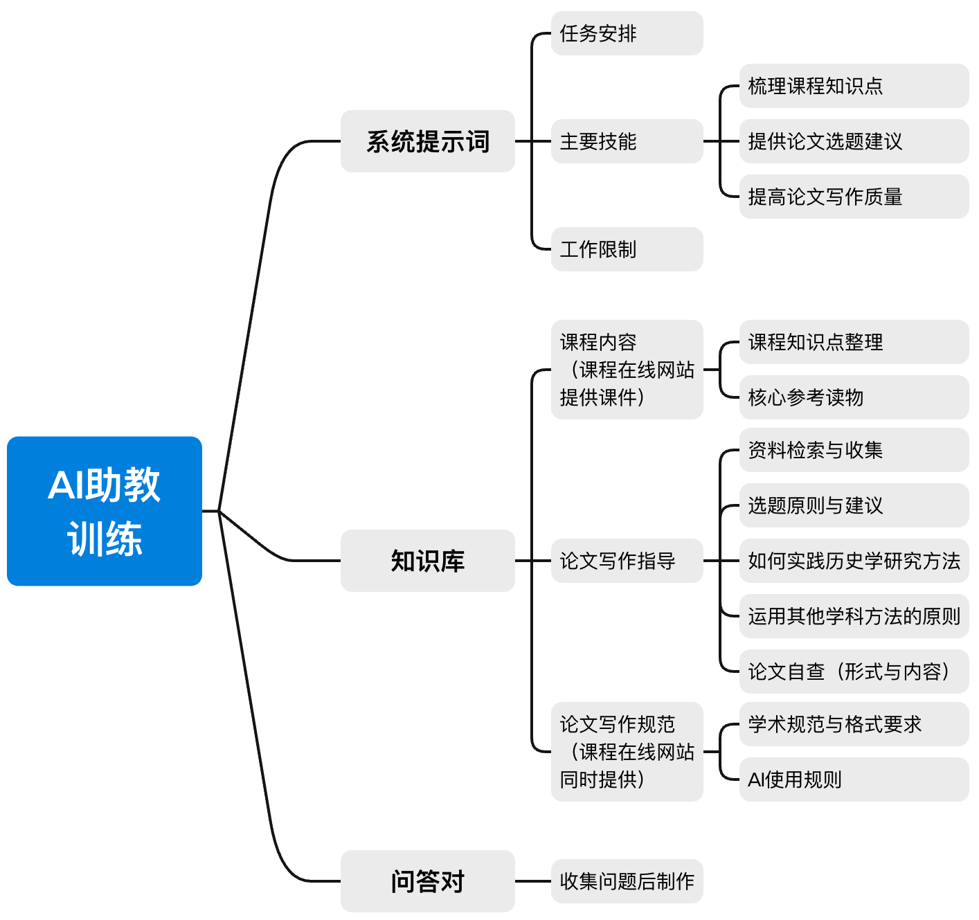 训练AI智能体的常用手段是提供系统提示词、高质量知识库和问答对。三者共同的目标是减少通用大语言模型生成时出现幻觉,提供更可靠、更有针对性的答案。系统提示词即是智能体工作的准则,可以提供的文本总量较少,形式上则要便于AI访问和使用。其中需要解释AI助教的工作目标、主要技能和运行中的限制。目标和技能都包括三个方面,即梳理课程内容、确定论文选题和提高写作质量。具体而言,涉及到智能体应优先访问哪些资料,哪些选题符合课程要求并更具有可操作性,以及写作中的注意事项。至于AI助教的行为限制,则包括该智能体只能提供建议,不能代为生成文稿,以及面对现有知识库不能覆盖的问题时,智能体应如何解决。