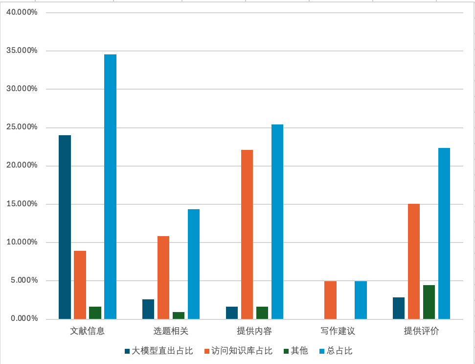 如果对学生提问的内容和机器的回答进行更为细致的分析,既能发现他们感兴趣的问题,也能观察他们提问的方式,以及智能体是否可以准确地理解学生的意图,并以符合我预期的方式来回答。下图按照论文写作的工作流程排定先后展现学生提出不同类型的问题的比例。我对“访问知识库”的界定比AI助教平台定义的“知识库命中”显然要宽泛一点,包含了系统提示词发挥约束作用的情况。