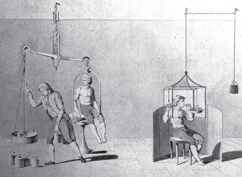 称重进食者:1791年阿尔曼·塞金(Armand Séguin)作为拉瓦锡消化实验的受试者。玛丽-安娜·皮埃尔特·保罗泽(Marie-Anne Pierrette Paulz,拉瓦锡夫人)绘,约1791年。