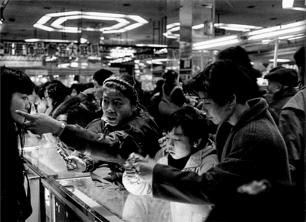 被压抑的世俗欲望蓬勃生长, 1965年中国人内心的“纯洁”曾让斋藤怀疑“是否到了没有个人欲望的程度”,他暗自担忧“这种状态能持续多久”。而如今,这一疑问已有了答案:情侣们在公园里大方地亲昵;迪斯科舞厅的外面,小贩在隐隐约约的港台音乐声中兜售香烟和口香糖;证券交易所里,人们看似为股票疯狂,实则可能只是在享受使用新手机的快乐;贵金属与饰品店里总是人头攒动;就连新婚夫妇的婚车,也一定要挂上“8888”这种寓意兴旺的车牌。人的本能欲望,终于在黑白光影中毫无保留地释放了出来。