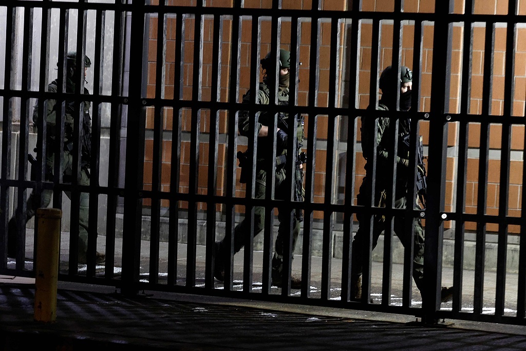 当地时间2026年1月3日,美国纽约,全副武装的警察抵达纽约布鲁克林大都会拘留所,委内瑞拉总统尼古拉斯·马杜罗预计将被关押在此。
