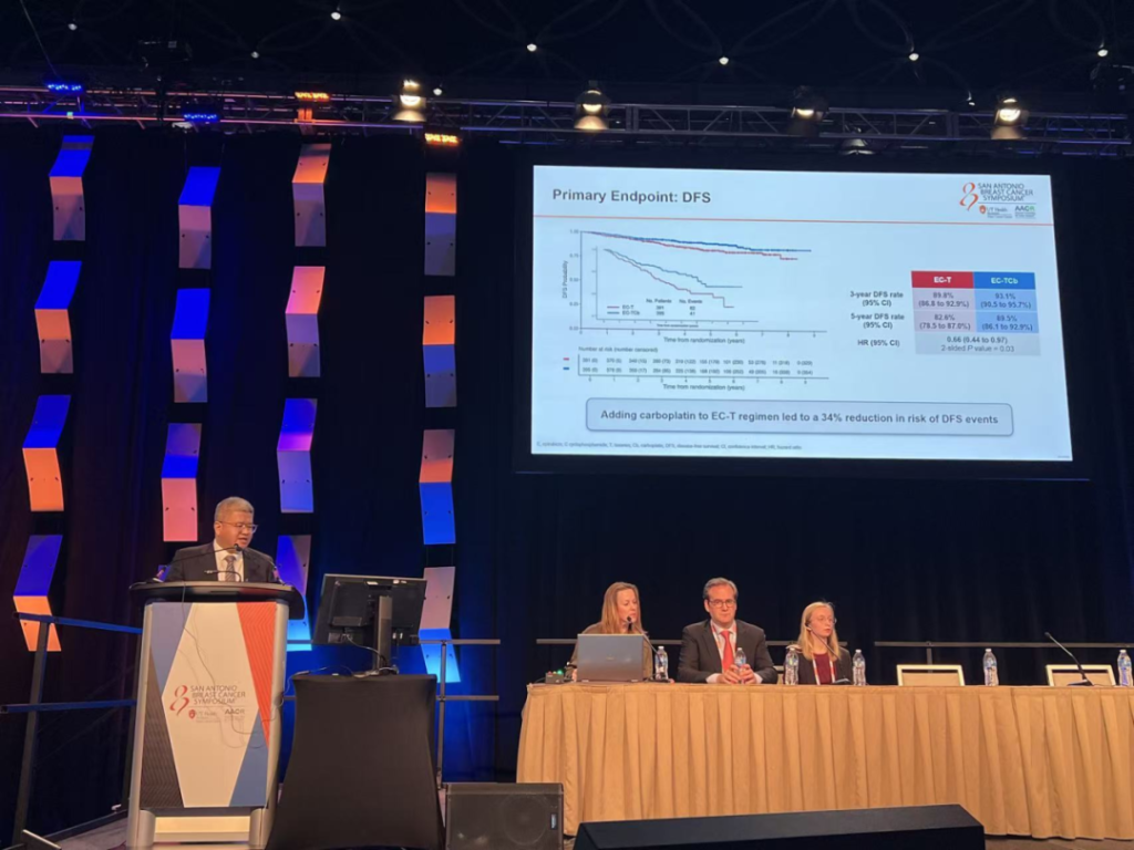 从2015年开始,在此前研究基础上,一项编号为RJBC1501的临床研究正式启动,这是一项由沈坤炜作为主要研究者牵头开展的全国多中心、前瞻性、随机对照Ⅲ期临床研究,联合全国19家医院共同参与,最终纳入786例早期三阴性乳腺癌患者。研究将患者按1:1比例随机分为两组,一组接受传统EC-T标准辅助化疗方案(表柔比星+环磷酰胺序贯紫杉类药物),另一组采用“瑞金方案”(EC-TCb方案,即在标准方案基础上加用卡铂),旨在验证铂类药物在辅助治疗中的临床价值。