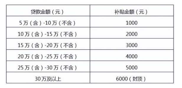 根据创业担保贷款金额,按以下标准发放补贴:享受创业担保贷款金额高于5万元(含5万元)低于10万元(不含10万元)的,给予1000元稳定创业补贴;每增加5万元贷款金额,增加稳定创业补贴1000元,最高不超过6000元。具体如下: