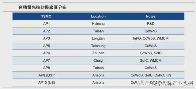 台积电的先进封装厂区广泛分布,包括龙潭(AP3)、台中(AP5)、竹南(AP6)、嘉义(AP7)、台南(AP8)等。其中,AP8 的扩产加速主要用于满足CoWoS-L 的需求,而嘉义的AP7 则专注于SoIC 和WMCM。在美国亚利桑那州(Arizona)的AP9 和AP10 厂区,未来规划亦将包含CoWoS、SoIC 及CoPoS 技术。