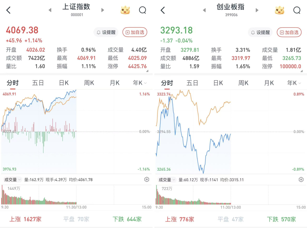 至午间收盘,上证综指涨1.14%,报4069.38点;科创50指数涨1.95%,报1430.81点;深证成指涨0.81%,报13940.24点;创业板指跌0.04%,报3293.18点。