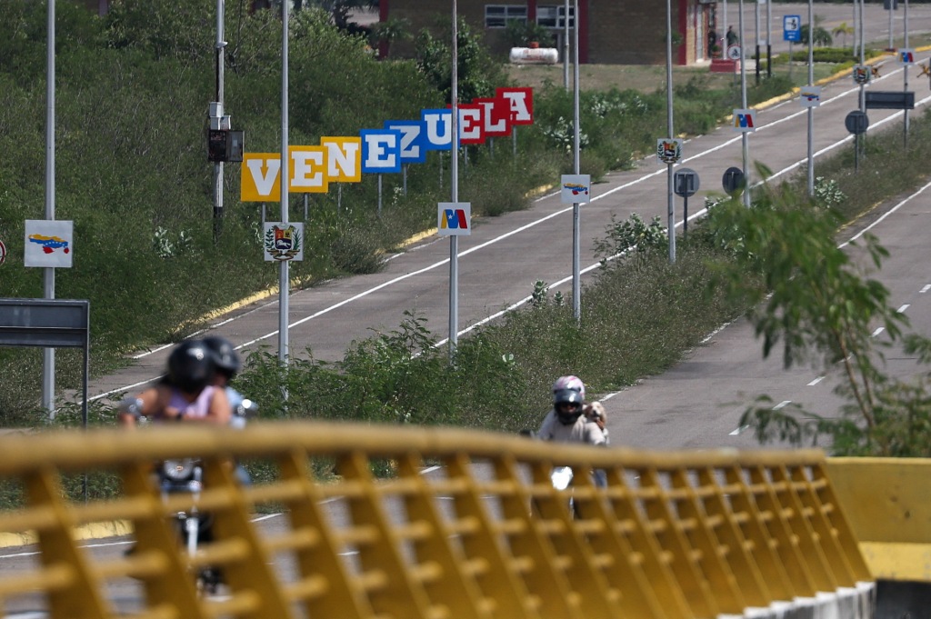 1月4日,人们骑摩托车通过连接委内瑞拉乌雷尼亚和哥伦比亚库库塔的廷迪塔斯边境大桥。新华社 图