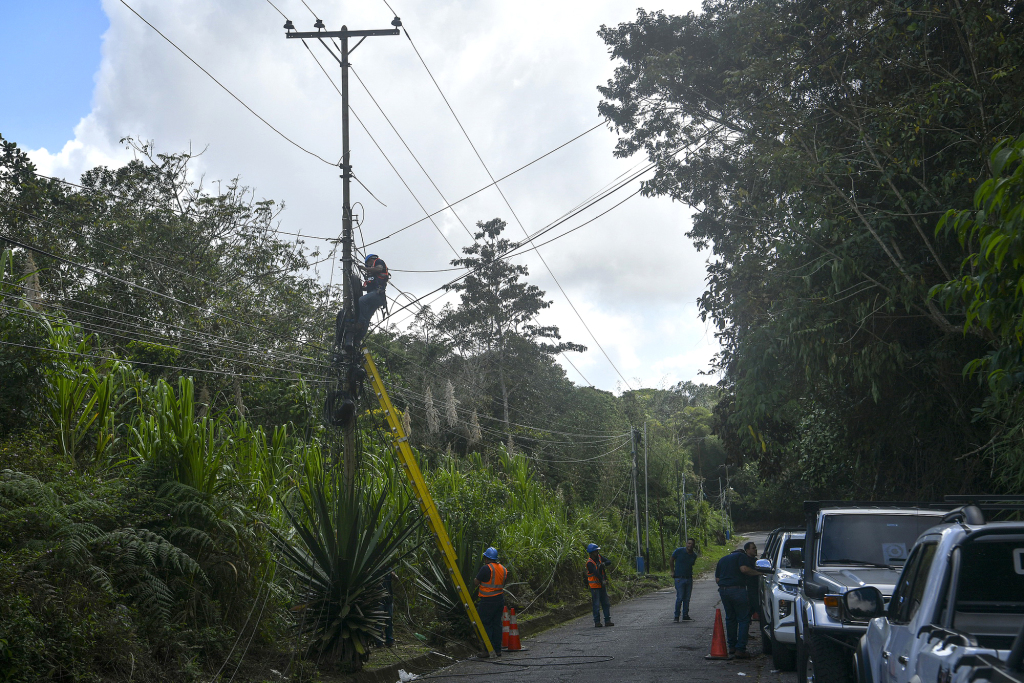 1月5日,委内瑞拉加拉加斯,工人正在埃尔火山地区抢修光纤和电力线路。该市是首批遭到美军袭击的地区之一。
