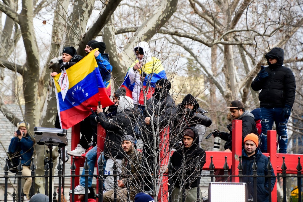 法院外,抗议者举着“释放马杜罗”“不要向委内瑞拉开战”等标语横幅,不时高呼口号,要求释放马杜罗,抗议美国军事干涉委内瑞拉。