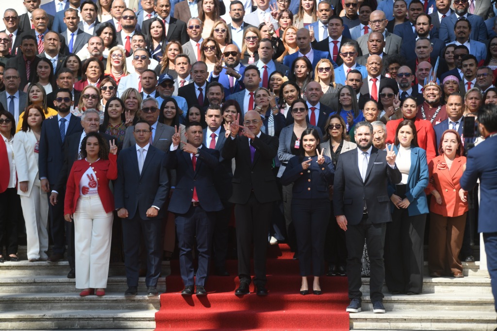 1月5日,在委内瑞拉加拉加斯,委内瑞拉全国代表大会主席豪尔赫·罗德里格斯(中)与议员们合影。新华社 图