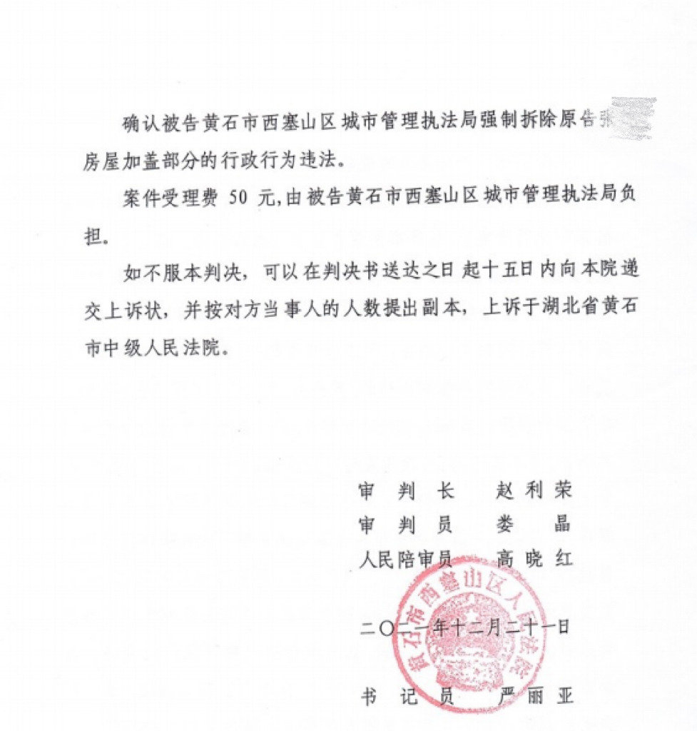 2021年12月21日,西塞山区法院对该案作出判决。法院认定,案涉房屋加盖部分未取得规划许可,亦无其他审批手续。同时表示,合法实施的强制拆除行为,应当遵循法定的程序。