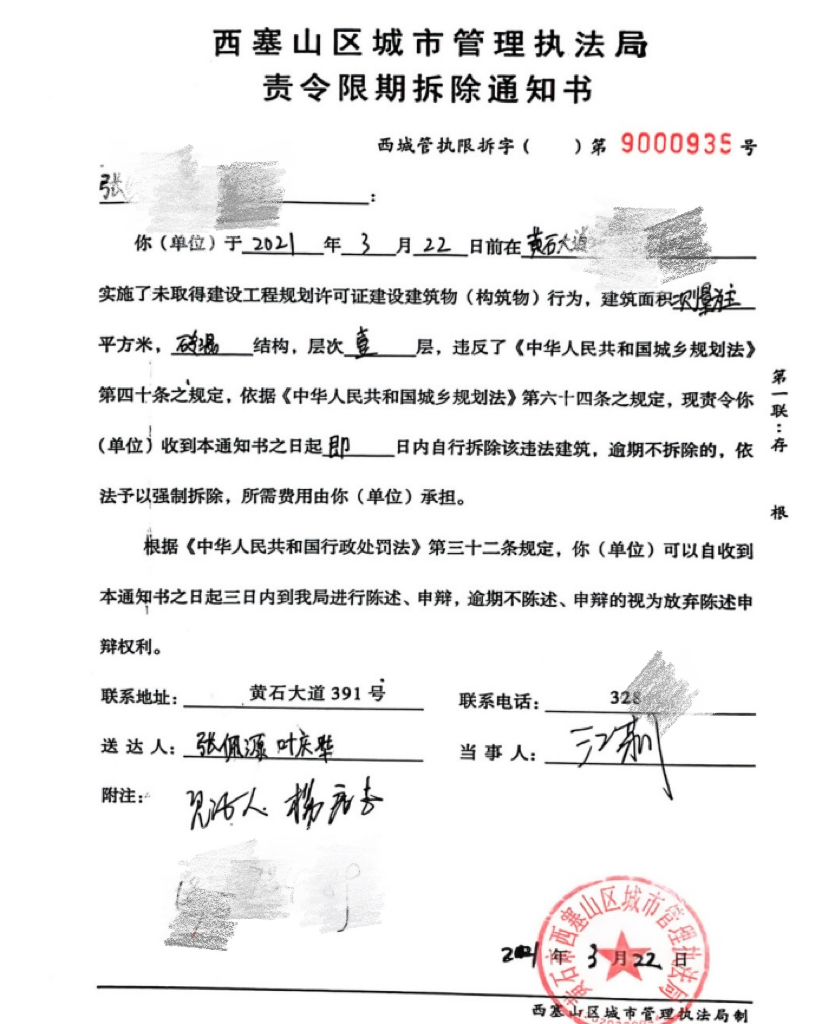2021年3月22日,张梅家人收到西塞山区城管局的《责令限期拆除通知书》,称其加盖部分属于违建,需限期拆除。4月27日,相关工作人员对案涉房屋加盖部分进行了拆除。