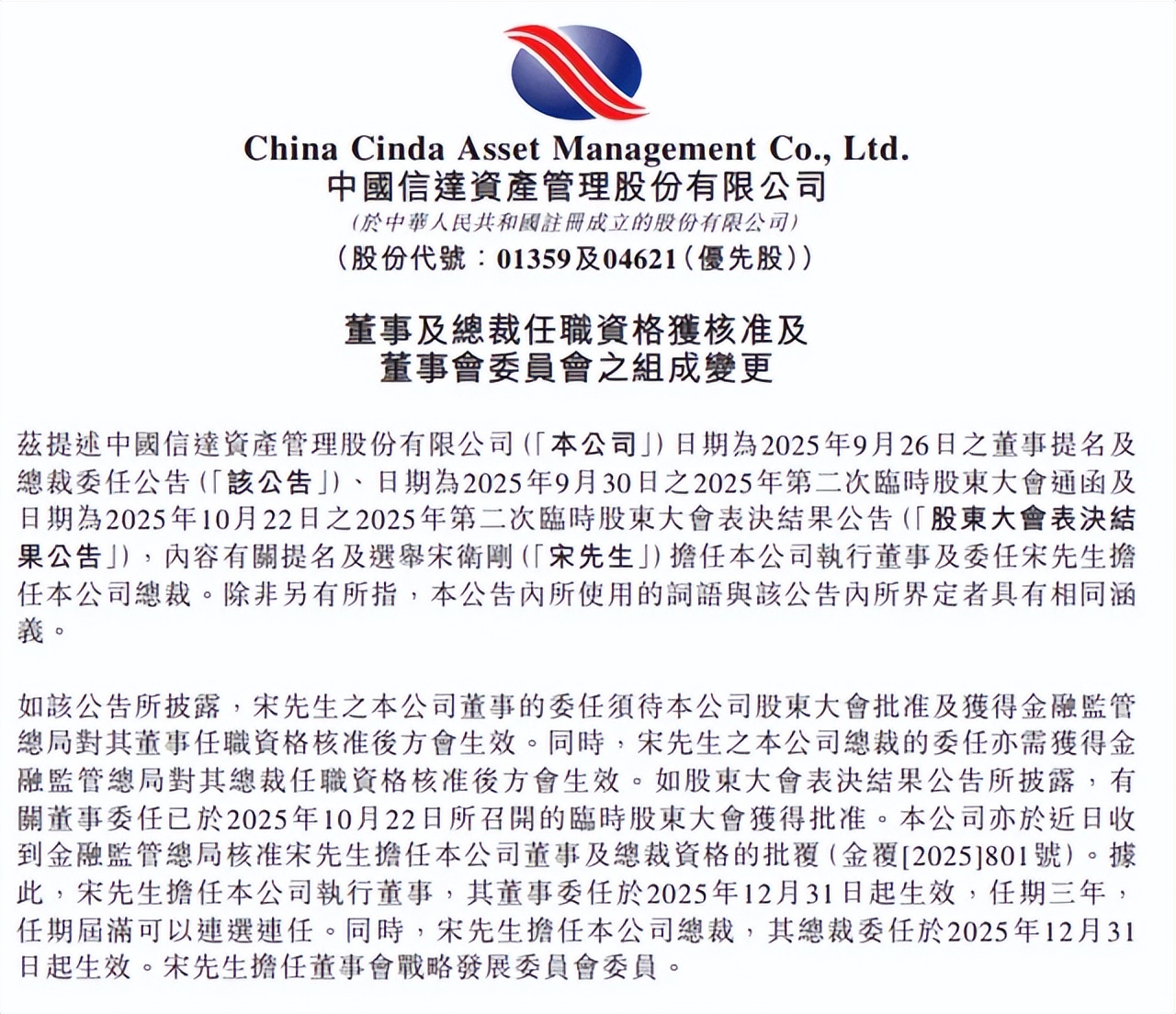 2026年1月5日,中国信达发布公告,新总裁宋卫刚任职资格已获核准,其同步担任公司执行董事、董事会战略发展委员会委员,任命均自2025年12月31日起生效。