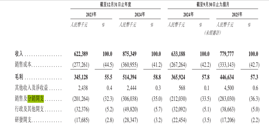 为维持品牌影响力与销售增长,公司投入巨额营销费用,且增速持续高于营收增速。招股书数据显示,2023年、2024年和2025年前9月,公司实现营收6.22亿元、8.75亿元和7.8亿元;同期,销售及分销开支分别为2.01亿元、3.06亿元、2.83亿元,占营收比例从32.3%攀升至35%,进一步增至36.3%。