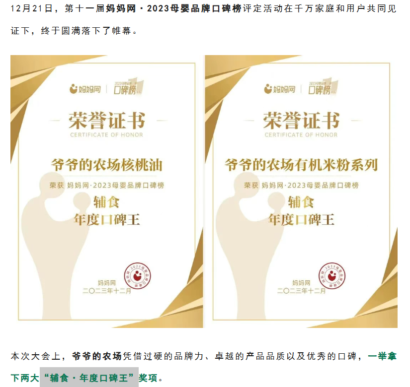 澎湃新闻注意到,自爷爷的农场成立以来,在妈妈网的母婴品牌口碑榜中,爷爷的农场多次斩获奖项,而品牌则将这些获奖情况广泛用于自身宣传渠道及媒体推广。