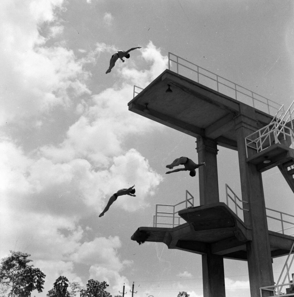 南京市五台山游泳池举办江苏省水上运动会跳水比赛,1960年9月。晓庄 作品