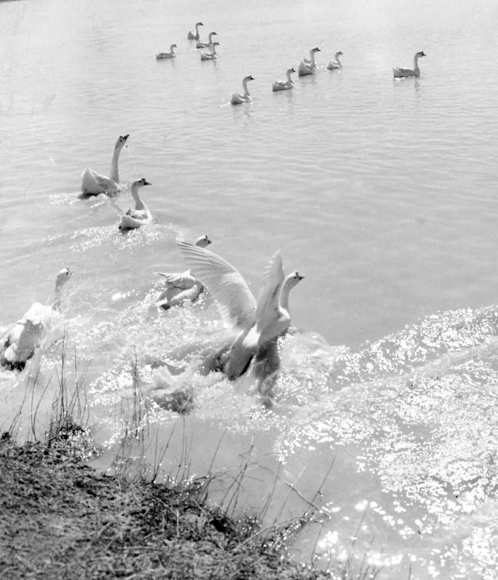 她面对摄影往往时而兴致盎然,时而悲观残酷。这种双面性对于今天的年轻人来说很难直接理解。就如同她谈到在1962年发表《踏碎银波》前,她为取名字犯了难。原本想取“惊鹅”,就是把鹅惊了之意。但这个标题显然不怎么样,她自认在部队时还是个小知识分子,因为书读到了高二,而部队大部分则都是“文盲”。但到了报社就不一样,报社里有很多民国时期的老报人,水平很高。她正在为命题发愁的时候,当天值夜班的报社领导高斯来到摄影组,高斯是新四军老报人,不仅文笔好,而且学识丰富。看了照片后即兴给照片取名“踏碎银波”,一下子就赋予作品新意涵。“尽管对这些动物摄影小品,我打心眼里喜欢,可总担心害怕。拍了《踏碎银波》之后,我对鸡鸭鹅一直感兴趣,‘四人帮’粉碎后,我拍了《生机勃勃》,在1977年全国影展上获优秀作品奖,并到美国、朝鲜、比利时展出,也入选了《中国摄影三十年摄影艺术作品集》。我喜欢拍这些玩意儿,反映新气象,对那种命题作文的新闻摄影真的没兴趣。”晓庄说。