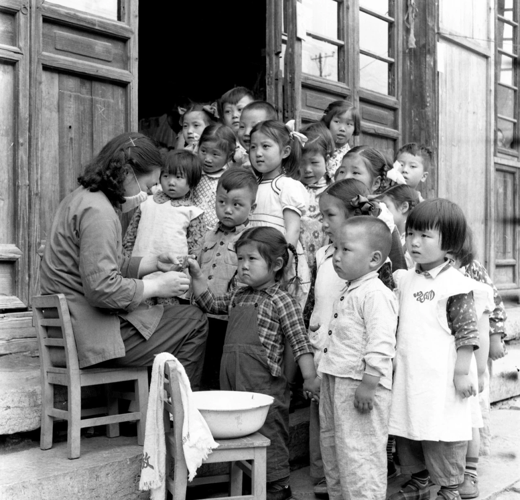 南京市淮海幼儿园老师为幼儿剪指甲,1957年5月7日。晓庄 作品