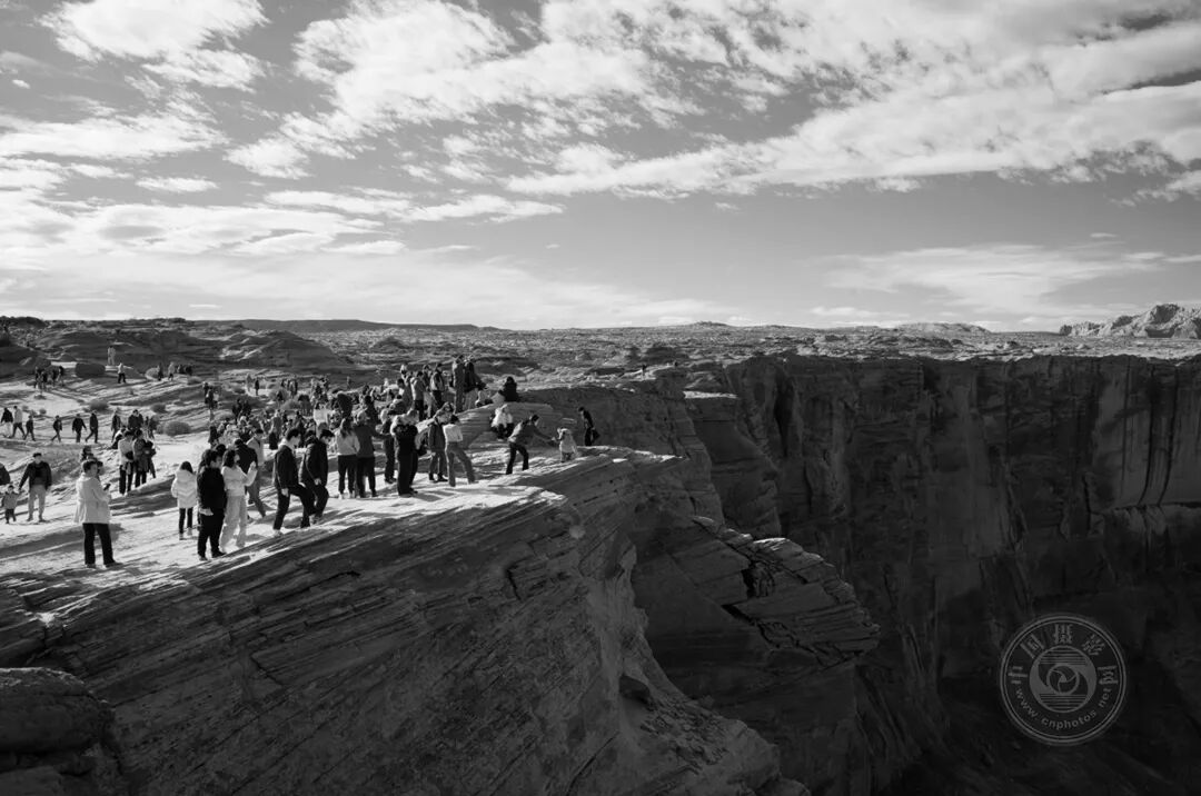 这个项目通过观察游客与景点的互动(游客本身也成为景观的一部分),探讨了美国旅游业中的“表演性”特质。这组摄影作品挑战了游客们追求的传统风景摄影理念——干净、宁静、除自身外无他人干扰。但在社交媒体与旅游营销过度美化的热门景点,这往往难以实现。自“名片式照片”(carte de visite)发明以来,旅行摄影便应运而生,个人纪实的仪式已成为现代旅游业中至关重要且不可避免的一部分。我们为何选择活在未来而非当下?我们看到的是世界的本来面目,还是仅在记录之后才“看见”它?胡(Xihao Hu)用自己的影像对这一摄影理想提出质疑,呈现了布满游客的非传统风景。
