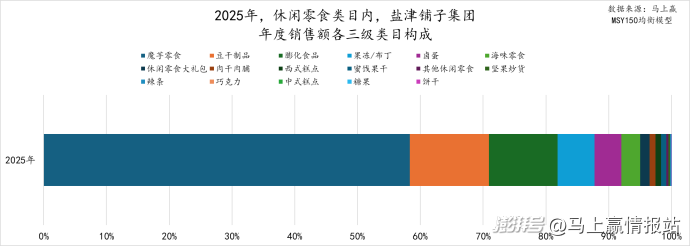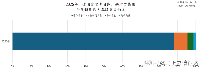 具体来看各个集团的销售额三级类目构成情况:盐津铺子在2025年的销售额三级类目构成中,魔芋零食占比超50%,豆干制品、膨化食品占比也超10%,还有果冻/布丁、卤蛋和海味零食等类目也占有一定份额。在上周的数读专题中,马上赢情报站对魔芋零食进行了详细分析,盐津铺子的子品牌大魔王通过“麻酱素毛肚”创新品类+大单品策略实现高速增长,目前已然成为盐津铺子集团的第二增长曲线,详见:数读「魔芋零食」:增速领跑休食,卫龙盐津铺子“激战正酣”