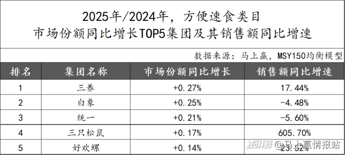 在方便速食类目中,2025年市场份额同比增长TOP 5的集团分别为三养、白象、统一、三只松鼠和好欢螺。其中,三养市场份额同比增长达0.27%,其销售额同比增速也超过15%,继续维持快速增长的态势;排名第二第三的白象、统一,其市场份额同比增长虽然为正,但受限于方便速食类目整体的颓势,两个集团的销售额同比增速均为-5%左右,份额上有增加但规模上却承压;排名第四的三只松鼠值得关注,作为休闲零食领域的领头羊,三只松鼠在近两年一直在进行多元化经营,其在方便速食类目中的布局也一年有余,取得了一定的进展。