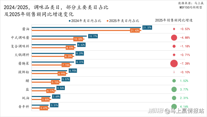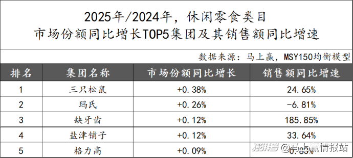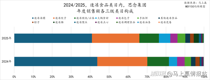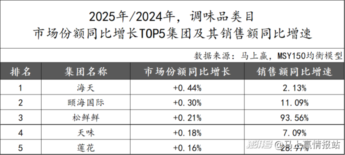 在增长集团部分,同样基于调味品、速冻食品、方便速食、乳制品、休闲零食(不含槟榔)五大类,我们以2025年集团市场份额同比2024年集团市场份额的增长绝对值进行降序排列,取各大类中绝对值增长前五名的集团列为类目增长TOP5集团,并提供了这些集团在该大类内在2025年的销售额同比增速。针对部分较有特色、代表性的集团,马上赢还分析了2024、2025年或2025年单年,这些集团在大类中的三级类目销售额构成及变化。
