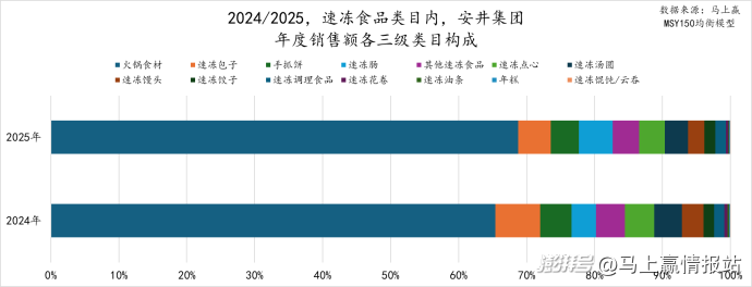 安井集团在2025年同比2024年的销售额三级类目构成变化与速冻食品下各三级类目的占比变化趋势较为一致。具体而言,类目构成仍以火锅食材为主,在集团内的销售额占比超过60%,相较2024年占比更高;同时,其速冻馄饨、速冻馒头等传统速冻类目的占比出现明显下降,速冻肠、手抓饼、速冻调理食品等类目的占比则显著上升,这或许也是安井集团顺应速冻食品市场发展趋势所做出的结构性调整与变化。