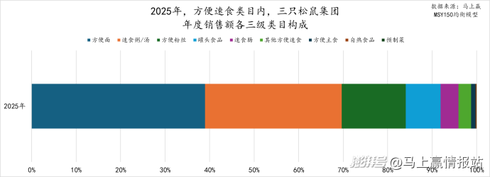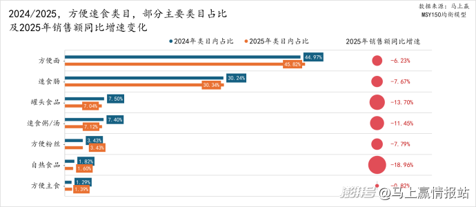 具体到不同三级类目来看:方便面仍为方便速食内占比第一的类目,且其占比在2025年还有进一步提升,但由于类目整体承压,其销售额同比增速为-6.23%;速食肠占比略有提升,但销售额同比负增长为-7.67%;方便主食类目虽然占比较小但有轻微提升,其销售额同比增速下降小于1%,好于方便速食类目中的大多数其他类目。