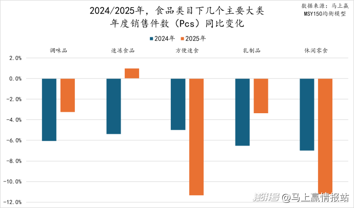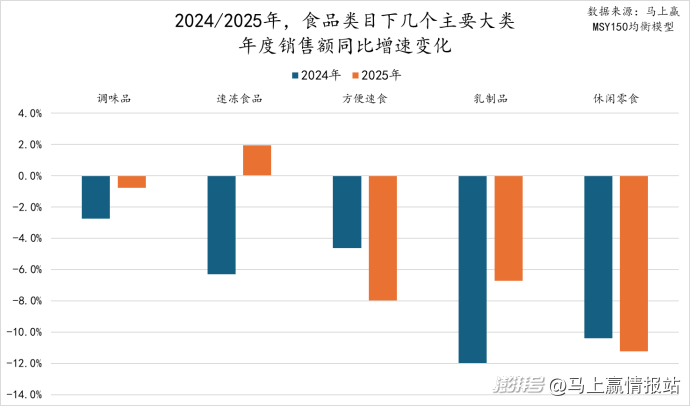 相对来讲,压力更加显著复杂的是方便速食以及休闲零食类目,其中方便速食类目,2025年的销售额同比下滑相比2024年有着接近翻倍的扩大,2025年同步下滑达8%;休闲零食则是在2024、2025两年都处于较深度的下滑中,与休闲零食类目零售渠道的碎片化、价格战激烈、消费者产品选择下移等均有关系,两年的销售额同比增速下滑均超过10%。