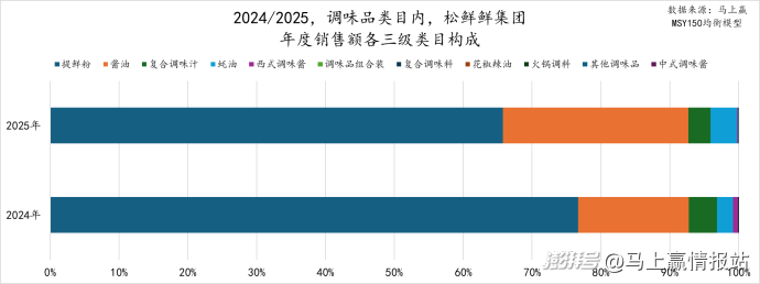 从松鲜鲜集团年度销售额的三级类目构成变化来看,松鲜鲜代表性的松茸类调味料所在的提鲜粉类目占比超过60%,虽然仍占据销售额的绝大多数,但是2025年相比2024年占比有明显降低。酱油、蚝油两个类目的销售额占比均有所上升,但其复合调味汁、西式调味酱两个类目的销售额占比则有所下降,可能是由于集团快速增长所致的占比稀释。