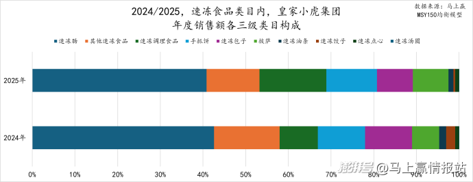 速冻肠在速冻食品类目中的占比以及销售额同比增速均迅猛增长,但类目的增长速度并没有赶上皇家小虎的增长速度,皇家小虎的销售额同比增速更快,这也就造成了一个独特的现象:在各家集团的速冻肠类目占比都在增长的2025年,以速冻肠为核心的皇家小虎,速冻肠在集团销售额三级类目构成中的占比反而在下降。