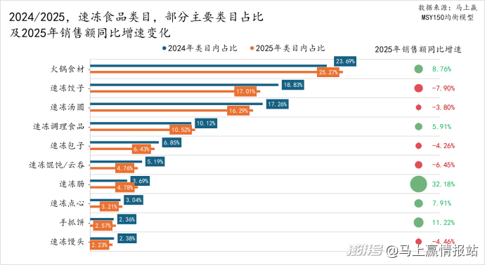 与之相对应的则是以非主食角色为核心,通过空气炸锅、烤箱、电火锅涮锅等新兴厨电或烹饪方式加工的类目,其市场表现与发展趋势与传统类目完全不同:火锅食材、速冻调理食品、速冻肠、速冻点心、手抓饼等类目均取得了占比和销售额同比的双双增长。具体而言,火锅食材占比持续增长,2025年占比已超25%,且销售额同比增长也超过8.76%;速冻肠销售额同比增速高达32.18%,市场份额也提升了1%以上。此外,手抓饼、速冻点心、速冻调理食品类目也均在占比提升的基础上实现了可观的销售额同比增长。它们一方面采用与传统蒸煮不同的火锅、空气炸锅等新兴烹饪方式,更适应当下年轻人的生活方式与节奏,更有仪式感、更有情绪价值;另一方面通过速冻的方式减少添加剂、防腐剂,使得产品更健康、更有品质。