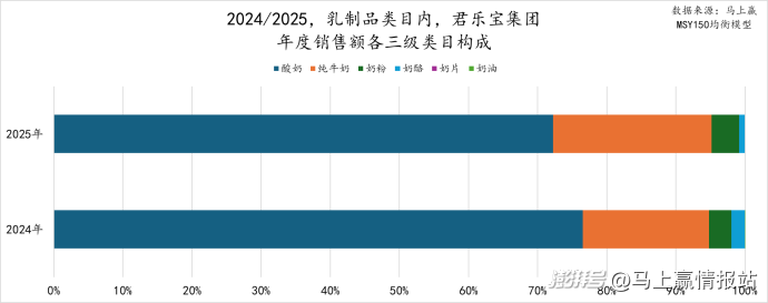 从君乐宝集团的年度销售额三级类目构成来看,酸奶仍然是君乐宝集团的绝对主营类目,其在2024年、2025年的销售额占比均超过70%,但2025年相较2024年有所下降,纯牛奶的占比则有着显著的增长。君乐宝集团主打低温鲜牛奶的子品牌“悦鲜活”2025年在各种渠道大力推广不同规格、不同特点的鲜奶产品,取得了很好的市场反响。集团的奶粉占比有略微增长,奶酪的占比则有着显著的下降。