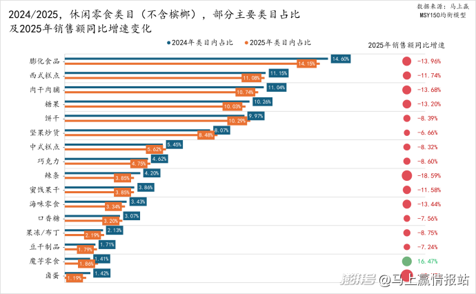 休闲零食类目构成的三级类目整体较为复杂,在选取的部分类目中,大多数类目的销售额同比增速均为负,且部分类目的负增长较为显著,如卤蛋类目跌幅高达-25.77%,辣条也达到-18.95%,为类目中压力较大的子类。从占比来看,饼干、坚果炒货、中式糕点、巧克力、口香糖、果冻/布丁、豆干制品类目内占比有所提升。唯一实现销售额同比增长的是魔芋零食类目,其2025年销售额同比增速高达16.47%,在去年的最后一篇文章中,马上赢也曾专题研究过这个类目(数读「魔芋零食」:增速领跑休食,卫龙盐津铺子“激战正酣”)。