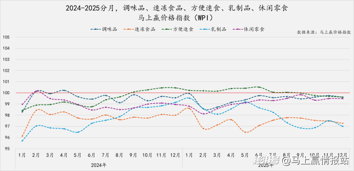 在过去两年几个类目的马上赢价格指数表现上,最显著的共性是除了方便速食在2024年9月到2025年7月指数超过100外,其余类目排除春节错位带来的影响,绝大多数时间价格指数均低于100,这也意味着除方便速食外的其他类目,近两年都有着较为显著的价格下行压力,尤其是速冻食品、乳制品,两年全年未超过100,整体在97-98上下徘徊波动。