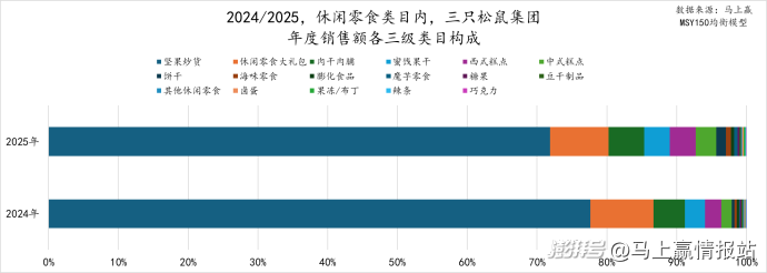 从三只松鼠集团在2025年的销售额三级类目占比来看,最主要的品类仍为坚果炒货,其占比超过70%但相较于2024年有所降低。相对的,肉干肉脯、蜜饯果干、西式糕点、中式糕点、饼干、海味零食、膨化食品、魔芋零食等类目的占比则都同比有所提升。这也或可说明2025年三只松鼠的销售额三级类目构成相较于2024年更趋多元,既体现出三只松鼠在休闲零食类目的野心与势头,也对其运营和管理能力提出了更高的要求。