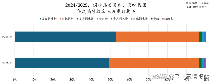 天味则主要在复合调味料、火锅调料类目经营,两个类目相加的销售额占比超过了95%。但从2024、2025两年的结构性变化看,复合调味料的占比在提高,火锅调料的占比则在降低。相比火锅调料来说,复合调味料的应用场景更多,更灵活更广泛,也符合集团多类目经营及增长的需求。