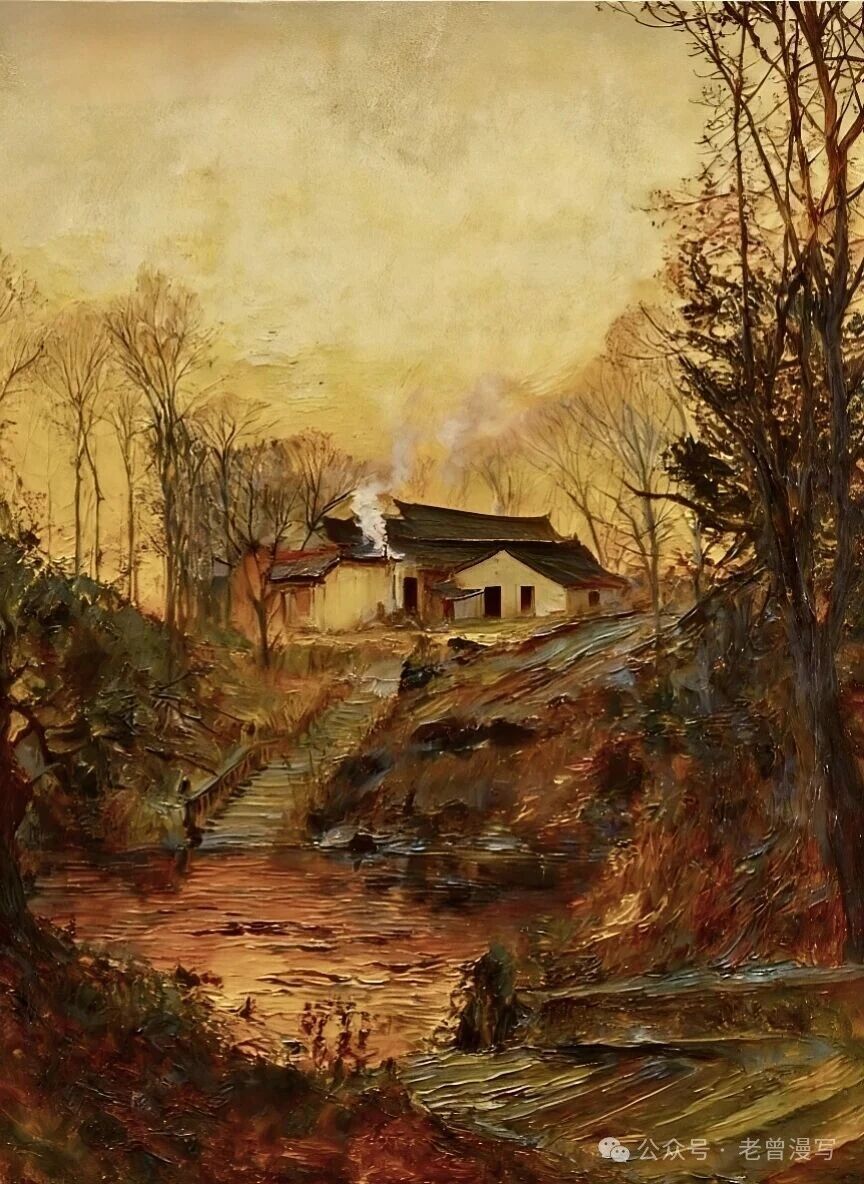最令人心安的,莫过于那缕飘向天光的炊烟。它从农舍的屋顶升起,带着灶火的暖意,不疾不徐,不争不抢,缓缓融进高远的天光里。它不是画卷的主角,却成了整幅作品的灵魂。这缕烟,是人间的烟火气,是灶台上的粥饭香,是柴米油盐的踏实;它亦是精神的归处,是立于坚实大地之上,望向广阔天空的从容。它不证明什么,也不索取什么,只是静静升起,便成了清晨的一部分。这是画家对生活最深刻的体悟:日子的美好,从来不在轰轰烈烈的追逐里,而在“有坚实的大地可以站立,有温暖的事情可以做”的安稳里。