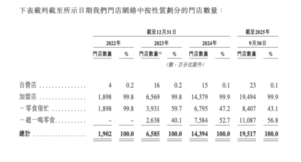 业绩成倍的增加,一方面是因为业务扩张,另一方面是因为对“赵一鸣零食”收购,鸣鸣很忙在2023年12月起开始合并“赵一鸣零食”的财务资料,2024年是收购事项后的第一个完整财年。也得益于合并扩张,2025年9月,鸣鸣很忙成为行业首家突破2万店的企业。