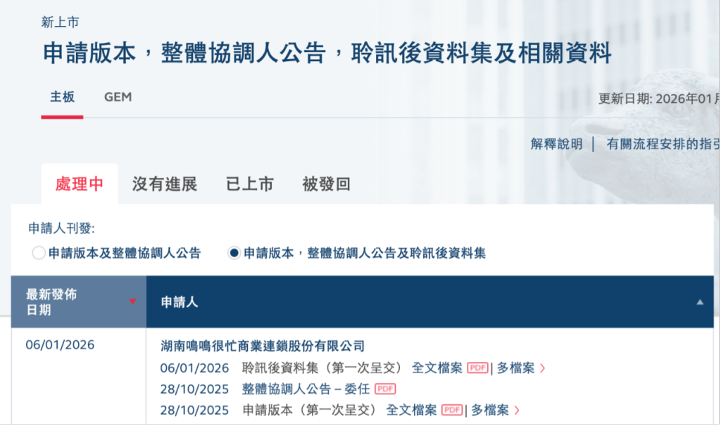 鸣鸣很忙由“零食很忙”与“赵一鸣零食”合并而来,两者于2023年11月完成合并,2025年4月,鸣鸣很忙正式向港交所递交上市申请,招股书失效后于2025年10月更新上市申请材料,二次递交招股书。