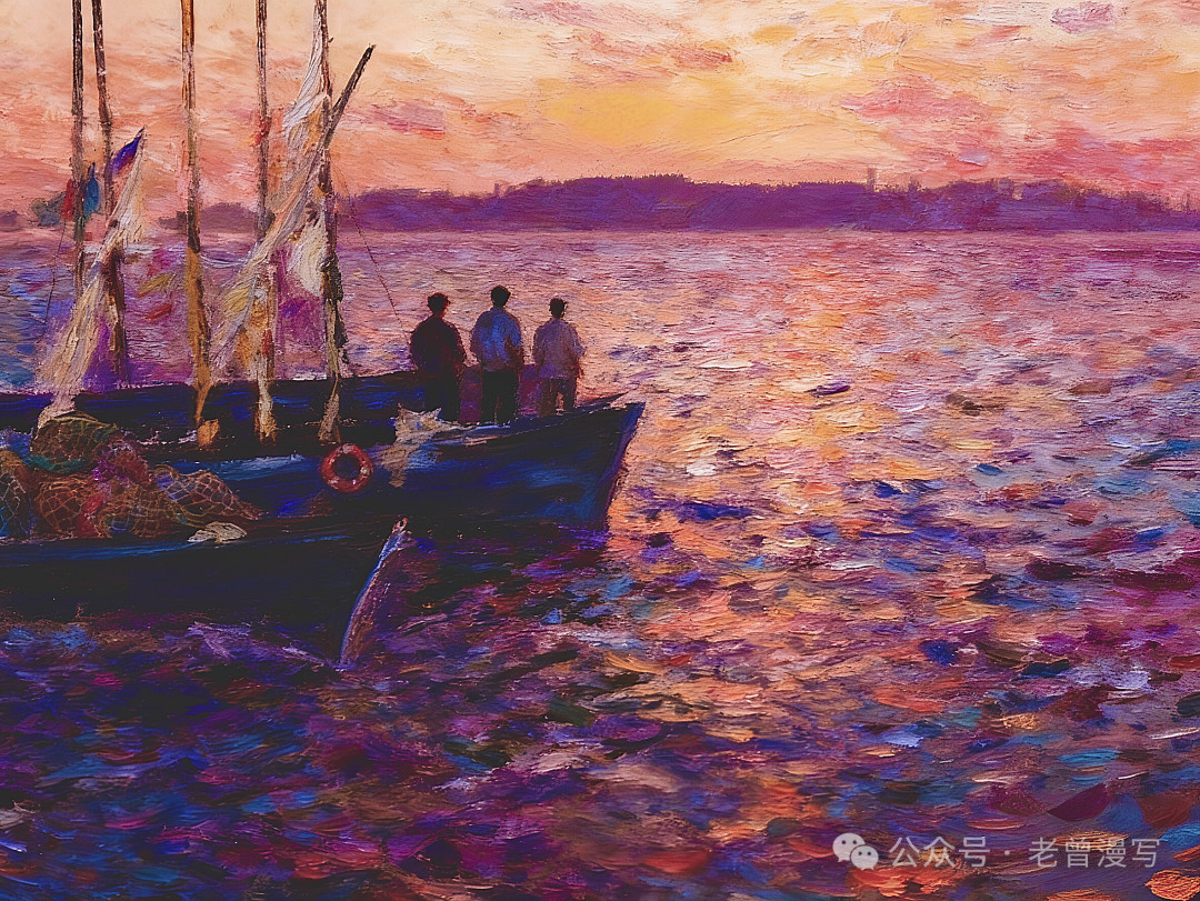 更深层的艺术价值,在于作品超越了风景油画的视觉呈现,升华为对生活本真的深刻叩问。画面中的渔民,是千万平凡奋斗者的缩影。他们无需言语,却深谙“天亮就该出海,有海就有生计”的朴素哲理,这份扎根大地、直面风浪的笃定,正是时代前行最坚实的底气。画家以细腻的笔触捕捉霞光落在渔民身上的温暖质感,将这份光塑造成无声的承诺——对早起者的收获之诺,对勇敢者的平安之诺,对认真生活者的意义之诺。这束晨光,不仅是自然的光影,更是照亮平凡日子的希望之光,它让观者读懂:生活的真谛,就藏在日复一日的启航与归航里,藏在直面风浪、守望晨光 的坚守中。