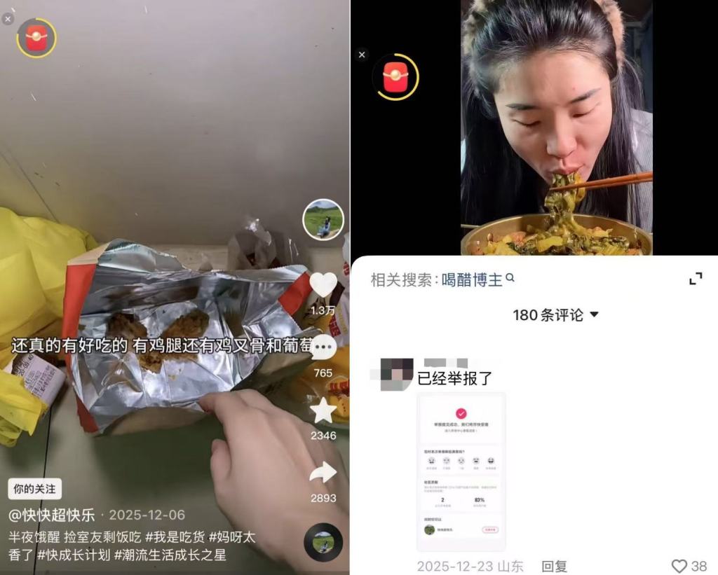 2025年12月,“快快超快乐”发布一条标题为“半夜饿醒 捡室友的剩饭吃”的视频,在四个平台共获2.3万点赞,近2000条评论。视频中,该博主先翻找装满垃圾的宿舍垃圾桶,捡出一袋开封的面包片与番茄酱,随后在堆有外卖包装与各种垃圾的宿舍外过道,捡走吃剩的几块炸鸡腿、鸡叉骨和小半串葡萄。紧接着,该博主向镜头展示其捡到的剩饭,随即津津有味地吃完。